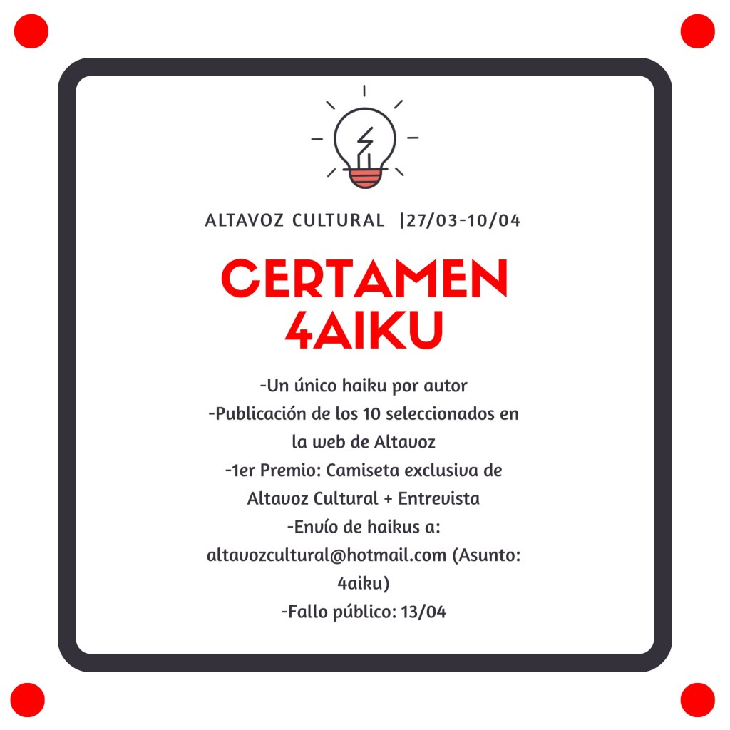 ¡Altavoz Cultural os vuelve a convocar, escritores! Esta vez os lanzamos este reto de haikus. Aquí puedes consultar las bases de este nuevo microcertamen: