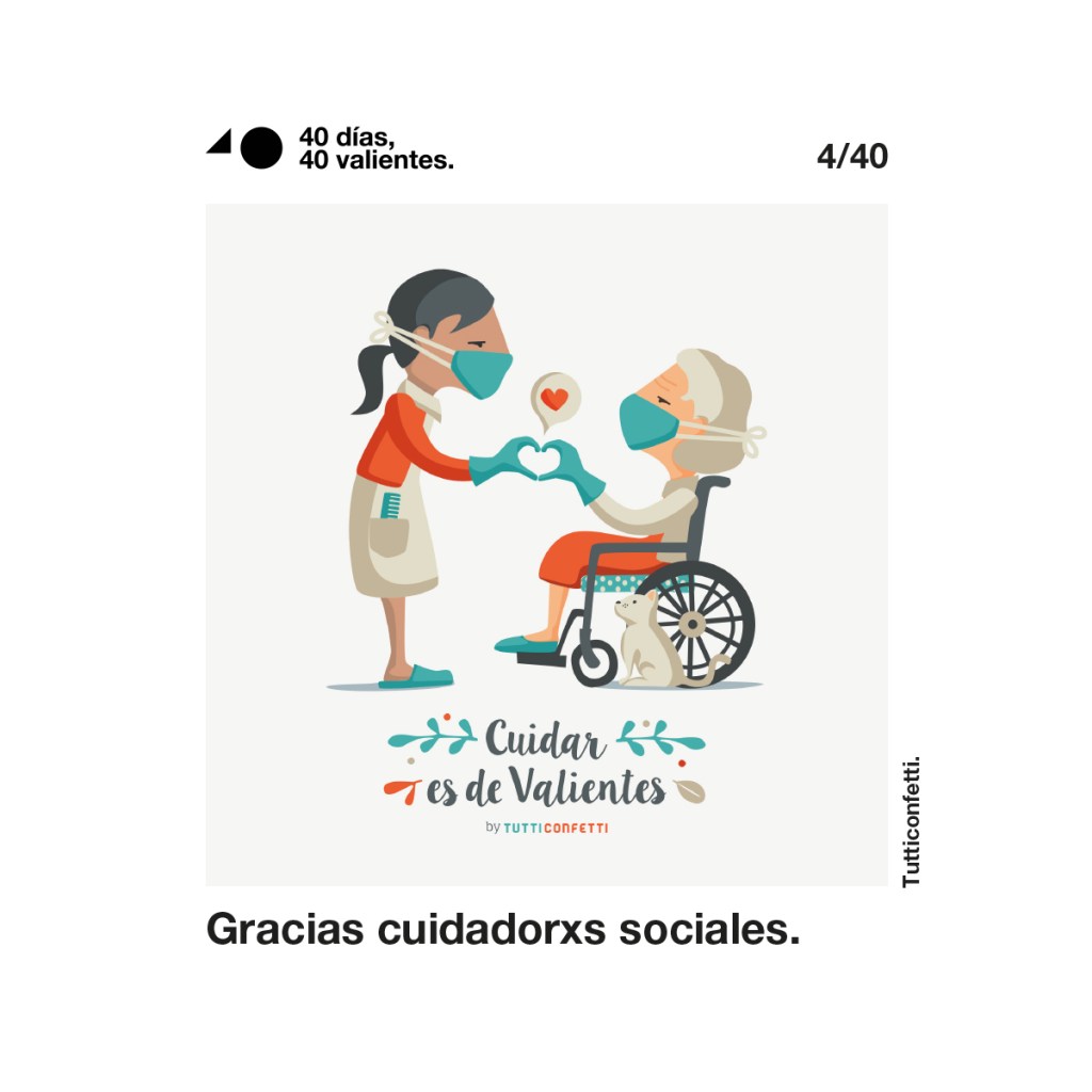 “Por su parte, @tutticonfetti ha dedicado su ilustración a todos los cuidadores y cuidadoras sociales, que con su trabajo ayudan, estimulan, prestan apoyo y ponen todo su cariño en el cuidado de las personas dependientes. El amor y la ternura son valores que quedan reflejados en su propuesta. Son varias las enseñanzas que ella extrae de este confinamiento: “Después de esto el planeta será más respirable, no daremos nada por sentado y quizás aprendamos a vivir el momento de una forma mucho más positiva.”