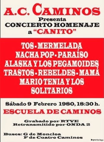 Este sentimiento de reciprocidad, de entendimiento entre los diferentes núcleos artísticos, va a confirmarse por todo lo alto el 9 de febrero de 1980 con el Concierto Homenaje a la memoria de Canito, batería del grupo Tos, en el Salón de Actos de la Escuela de Caminos de la Universidad Politécnica de Madrid. Nacía oficial, u oficiosamente, La Movida Madrileña.