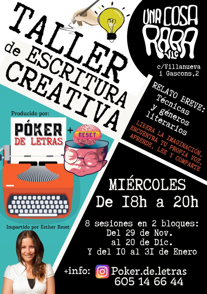 Recientemente, he abierto plazas para apuntarse a un taller de escritura creativa bajo el paraguas de la marca. Su fecha de inicio está prevista para el miércoles, 29 de noviembre, de 18 a 20 h, y se trabajará el relato breve aprendiendo técnicas y géneros literarios. Es un taller que llevo impartiendo más de diez años en Barcelona, y me apetecía retomarlo en Valencia. Tengo tres temarios distintos que irán viendo la luz, por lo que los talleres serán recurrentes y espero que funcionen por mucho tiempo.