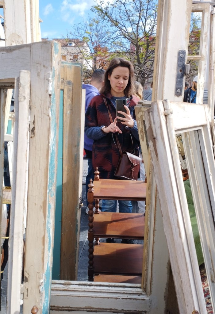 La luz del sol mezclada con la neblina me hace ver todos los colores con más detalle. Ya empiezan a estrecharse las calles, he llegado al Rastro. Ahora el paseo se atenúa, pues son tantas las cosas que llaman mi atención que con ellas podrían llenarse varias hojas… o un solo poema. Los espejos, sobre todo los espejos. Esos marcos dorados al aire libre, testigos invisibles de la historia de una ciudad en las mañanas de domingo, que reflejan piernas apresuradas, o a unas chicas que se hacen una foto; espejos que capturan el aire cálido, las voces de las gitanas y tenderos, y los zapatos de los que se paran unos momentos a regatear. ¡Barato! ¡barato! ¡aquí compre barato! Veo libros de segunda o de quién sabe cuántas manos y veo que hay autores que son asiduos de los mercados, siempre primeras novedades editoriales en los puestos desordenados: Marguerite Duras, Ramón J. Sender. Paso la mano por las tapas de los libros coloridos. No voy a comprarlos. Me basta con saber que existen, que están ahí, en esas grandes bibliotecas callejeras. Libros fuertes, que solo por el hecho de estar al aire libre, soportando la intemperie, se convierten en libros universales, en obras de la humanidad, no importa quién los haya escrito.