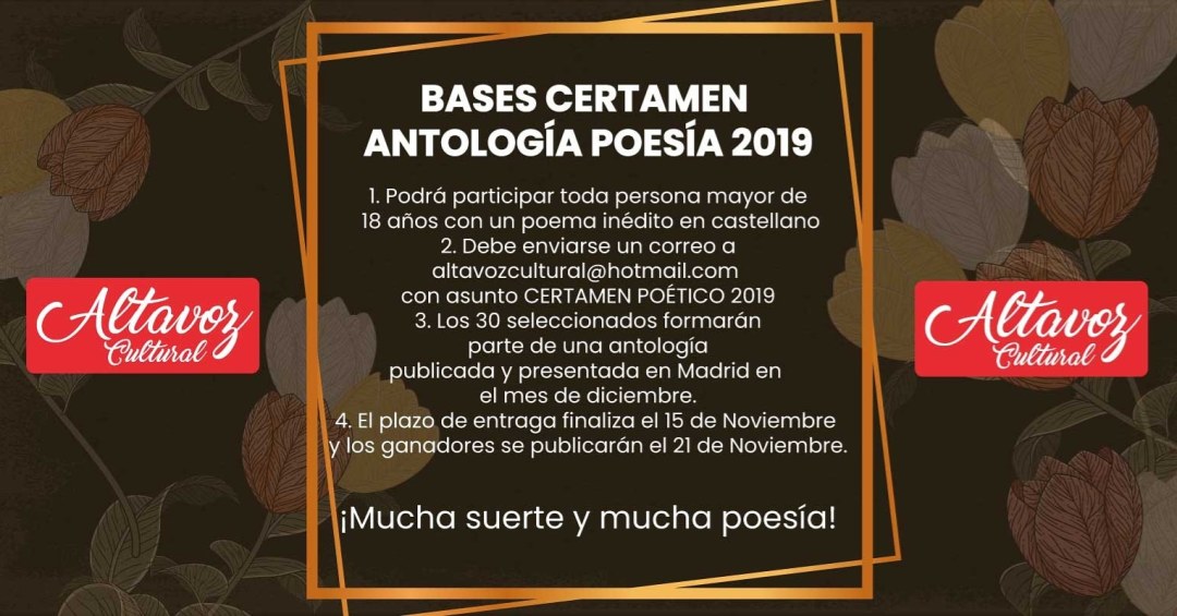 Altavoz Cultural convoca el presente certamen poético con arreglo a las siguientes bases: 1. Podrán participar todas aquellas personas mayores de 18 años sin restricción alguna por nacionalidad o lugar de residencia con un único poema inédito escrito en español, cuya extensión y cuya temática serán libres.2. Se seleccionarán los 30 mejores poemas, que serán … Sigue leyendo Certamen poético 2019