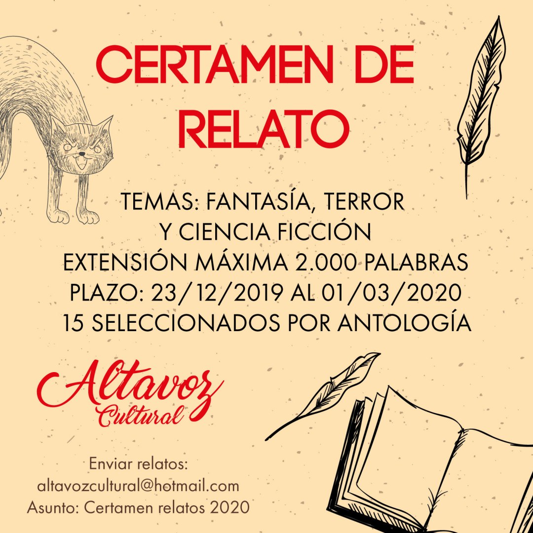 ¡Altavoz Cultural vuelve a convocaros, escritores! En esta ocasión buscamos estupendos relatos de fantasía, terror y/o ciencia ficción. ¡Os dejamos el cartel con las bases resumidas! Altavoz Cultural convoca el presente Certamen de Narrativa de Fantasía, Terror y Ciencia Ficción con arreglo a las siguientes bases: Podrán participar todas aquellas personas mayores de 18 años … Sigue leyendo Certamen de relatos 2020