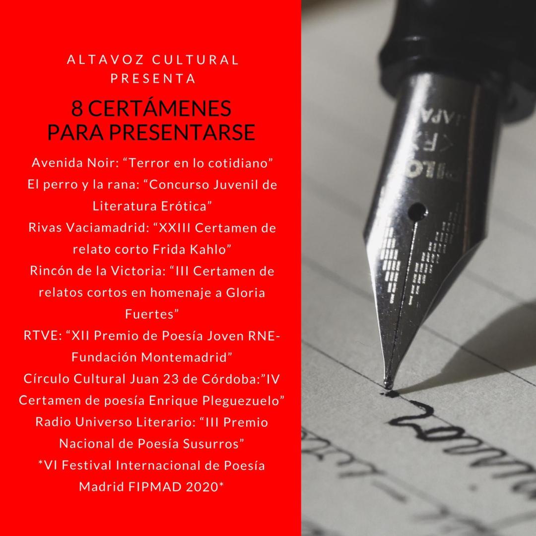 ·Avenida Noir: “Terror en lo cotidiano”: https://avenidanoir.blogspot.com/2020/04/queridos-noirs-llega-el-momento-de.html ·El perro y la rana: “Concurso Juvenil de Literatura Erótica”: II Concurso de Literatura Erótica ·Rivas Vaciamadrid: “XXIII Certamen de relato corto Frida Kahlo”: https://www.rivasciudad.es/wp-content/uploads/2020/04/BASES-XXIII-PREMIO-DE-RELATO-CORTO-FRIDA-KAHLO.pdf ·Rincón de la Victoria: “III Certamen de relatos cortos en homenaje a Gloria Fuertes”: http://www.rincondelavictoria.es/contenido/datos/noticias/certamen-relato-corto-Gloria-Fuertes.pdf ·RTVE: “XII Premio de Poesía Joven RNE-Fundación Montemadrid”: … Sigue leyendo 8 CERTÁMENES RECOMENDADOS