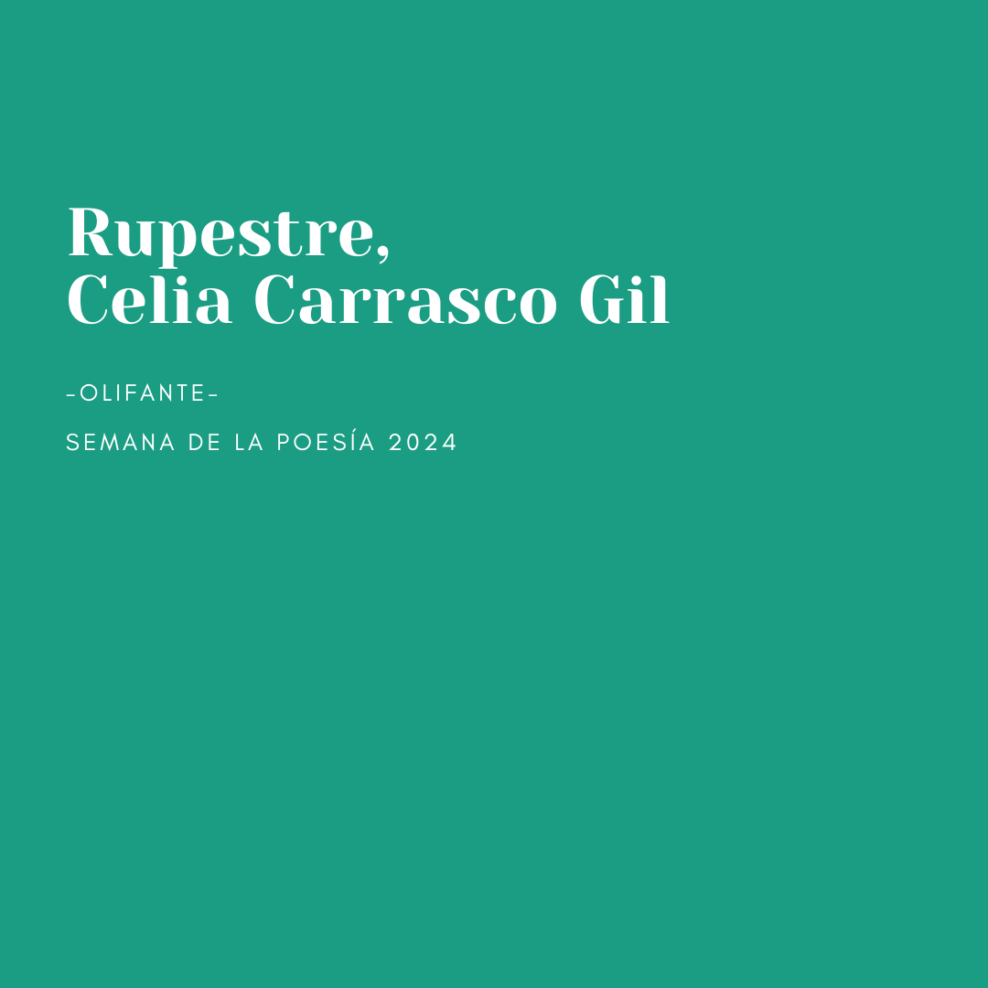-Olifante- Semana de la Poesía 2024 Celia Carrasco Gil es la debilidad poética de esta nuestra casa. Hemos llegado a esta conclusión tras haber disfrutado de otra exhibición versada en sus manos: Rupestre releva a Selvación en algunas de sus recurrencias lingüístico-visuales, en ciertos patrones formales y, por supuesto, en una calidad poética excelsa. Nos … Sigue leyendo Rupestre, Celia Carrasco Gil